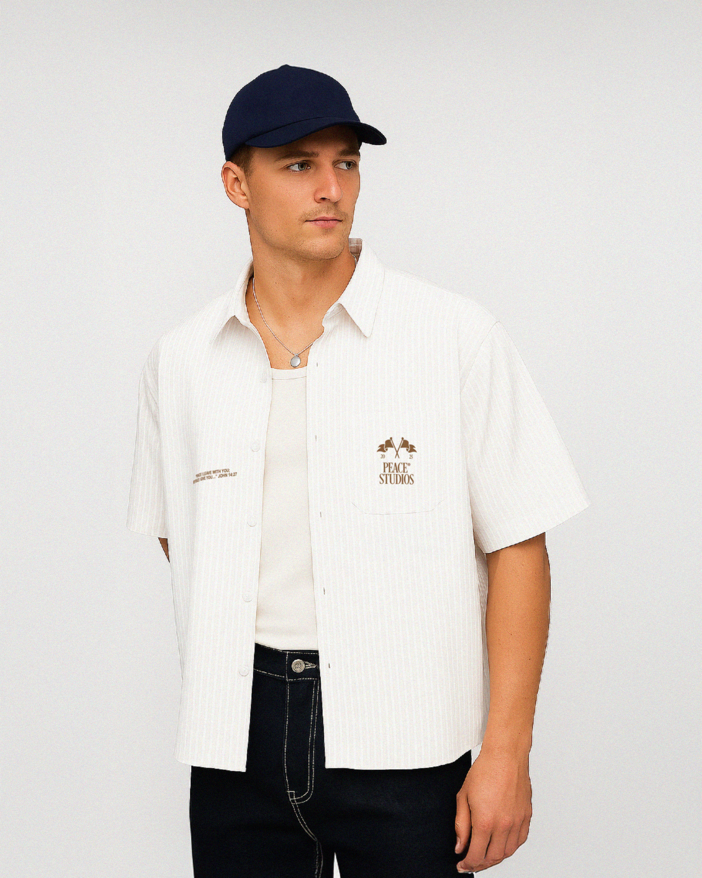 Crafted in a lightweight, breathable fabric, this short-sleeve shirt blends relaxed summer style with the truth of John 14:27: “Peace I leave with you; my peace I give you. I do not give to you as the world gives.”